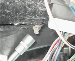 9. Торцовым ключом на 10 мм отворачиваем гайку крепления кожуха радиатора и наконечника "массового" провода вентилятора, расположенную за центральным воздуховодом.