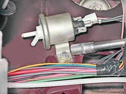 3. Для проверки работы клапана включаем зажигание. Исправный клапан должен открыться, и при подводе разрежения к центральному штуцеру воздух должен проходить. При отсоединении и подсоединении одного из проводов питания клапана, он должен срабатывать с характерным щелчком.