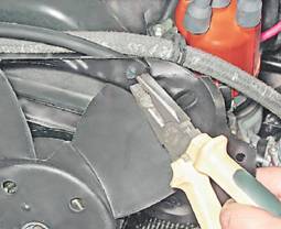 4. Приподнимаем электровентилятор, одновременно вытягивая оболочку проводов датчика из двух фиксаторов, расположенных на кожухе. На впрысковом двигателе отворачиваем болт крепления рукавов подвода воздуха к кронштейну крышки головки блока цилиндров (см. "Прокладка крышки головки блока цилиндров - замена") и, отодвинув рукава, приподнимаем электровентилятор. 5. Сжав пассатижами лепестки фиксаторов оболочки проводов датчика, выталкиваем фиксаторы из кожуха.
