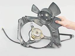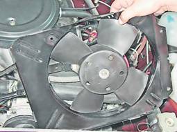 Электровентилятор радиатора - снятие и установкаЭлектровентилятор радиатора состоит из электродвигателя, крыльчатки и кожуха. Работа показана на автомобиле с карбюраторным двигателем. На автомобиле с впрысковым двигателем операции 2 и 5 - не выполняются. Снятие 1. Разъединяем колодки проводов электродвигателя крыльчатки.