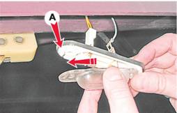 4. Отжимаем плафон от корпуса фонаря и сдвигаем в сторону фиксатора А. Выводим плафон из зацепления, снимаем его.