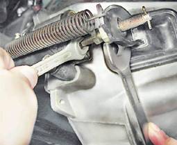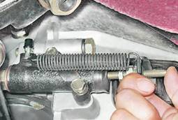 3. На автомобиле с системой впрыска снимаем дополнительный грязезащитный щиток (см. "Грязезащитный щиток - снятие и установка"). 4. Очищаем толкатель от грязи и наносим на его резьбу проникающую смазку. 5. Проверяем свободный ход толкателя рабочего цилиндра, от которого зависит свободный ход выжимного подшипника. Для этого, рукой отжимаем вилку сцепления назад до упора, при этом свободный ход толкателя должен быть в пределах 4-5 мм. Если усилие пружины слишком большое, то для удобства ее можно отсоединить от рычага.