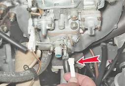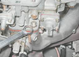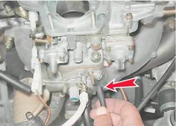 Карбюратор - снятие и установкаСнятие 1. Подготавливаем автомобиль к выполнению операций (см. "Подготовка автомобиля к ТО и ремонту"). 2. Снимаем корпус воздушного фильтра со шпилек карбюратора (см. "Корпус воздушного фильтра - снятие и установка"). 3. Ветошью очищаем от грязи и промываем уайт-спиритом или очистителем двигателя наружную поверхность карбюратора. 4. Ослабляем затяжку винта крепления троса привода воздушной заслонки (см. "Привод воздушной заслонки - проверка и регулировка"). 5. Ключом на 8 мм ослабляем затяжку болта крепления оболочки троса и отсоединяем трос от карбюратора.