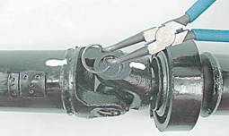Карданная передача - разборка и сборкаДля выполнения работы потребуются: новая крестовина в сборе, съемник крестовин, гайка вилки карданного вала и отрезок трубы с наружным диаметром 22 мм, внутренним не менее 15 мм и длиной 10 мм. 1. Снимаем карданную передачу (см. "Карданная передача - снятие и установка"). 2. Очищаем валы и шарниры от грязи, промываем их водой с моющим средством. 3. Наносим кернером или краской метки (с одной стороны вала) взаимного расположения вилок карданных шарниров во избежание нарушения балансировки карданной передачи. Разборка карданного шарнира На автомобиле с большим пробегом рекомендуется предварительно обстучать через подходящую выколотку (головку торцового ключа или старый поршневой палец) торцы стопорных колец и нанести на них проникающую жидкость. 1. Щипцами для сжатия стопорных колец снимаем четыре кольца.