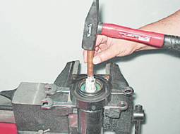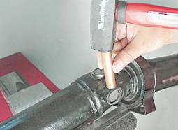 6. Установив промежуточную опору на два подходящих ключа или стержня, через выколотку из мягкого металла выбиваем вал из подшипника.