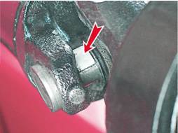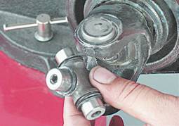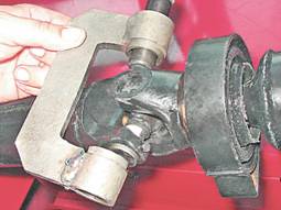Легкими ударами молотком через проставку запрессовываем подшипник в вилку немного глубже канавки под стопорное кольцо. Щипцами устанавливаем в канавку стопорное кольцо. 4. Перевернув вилку, запрессовываем второй подшипник до тех пор, пока первый подшипник не упрется в стопорное кольцо. Устанавливаем стопорное кольцо второго подшипника. 5. Аналогично запрессовываем подшипники в проушины второй вилки. 6. После запрессовки всех подшипников и установки стопорных колец следует обстучать проушины вилок легкими ударами молотка. Это необходимо сделать для того, чтобы прижать подшипники к стопорным кольцам. При этом появятся зазоры между торцами шипов крестовины и донышками подшипников, необходимые для нормальной работы соединения. Собрав шарнир, следует проверить его на легкость качания и отсутствие ощутимого от руки осевого люфта в обеих вилках. При обнаружении такого люфта следует установить стопорные кольца большей толщины. Снятие промежуточной опоры Промежуточную опору обычно приходится снимать при износе ее подшипника, однако, к этому времени, как правило, имеет повреждения и упругая подушка опоры. Поэтому целесообразнее заменить опору с подшипником в сборе. Для выполнения работы потребуется универсальный двухзахватный съемник. 1. Зажимаем в тисках передний карданный вал так, чтобы не деформировать трубу. 2. Тонким бородком расконтриваем гайку крепления вилки переднего карданного шарнира.