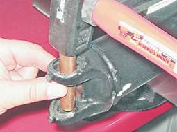 6. Перемещаем вилку переднего карданного вала с крестовиной в противоположную сторону и устанавливаем полукольца на шип крестовины (показано одно полукольцо).