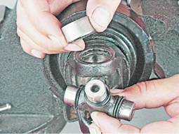 Покрываем тонким слоем смазки отверстия проушин вилок для облегчения запрессовки и защиты от коррозии. 2. Надеваем на шипы крестовины уплотнительные кольца (раздвоенной кромкой в сторону подшипника!) и устанавливаем пластмассовые торцовые шайбы в отверстия шипов крестовины. 3. Помещаем крестовину между проушинами вилки.