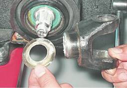 11. Нанося удары молотком через выколотку, выпрессовываем подшипники из вилок заднего и переднего карданных валов.