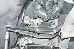 7. Снимаем с вала второй грязеотражатель. Установка промежуточной опоры 1. Устанавливаем промежуточную опору в обратной последовательности. На шлицы переднего карданного вала наносим любую пластичную смазку для защиты от коррозии. 2. Затягиваем новую гайку крепления вилки переднего карданного вала моментом 79,4-98,0 Н.м и законтриваем ее бородком. Снятие эластичной муфты Эластичную муфту обычно приходится снимать для замены ее резинового элемента (при его повреждении). Если элемент не поврежден и будет установлен на место, следует приобрести червячный хомут диаметром не менее 140 мм для стягивания муфты при установке. Новая муфта поставляется в комплекте со специальным монтажным хомутом. 1. Снимаем карданную передачу (см. "Карданная передача - снятие и установка"). 2. Торцовым ключом на 13 мм с удлинителем отворачиваем две гайки крепления поперечины коробки передач к кузову.