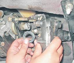 3. Для облегчения снятия и последующей установки (в случае использования прежней муфты) стягиваем ее резиновый элемент хомутом.