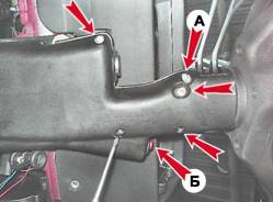 Кожухи рулевого вала - снятие и установкаДля выполнения работы потребуется ленточный хомут длиной от 100 до 130 мм. Снятие 1. Подготавливаем автомобиль к выполнению операций (см. "Подготовка автомобиля к ТО и ремонту"). 2. Крестовой отверткой отворачиваем четыре винта, соединяющих кожухи и саморез А их крепления к подрулевому переключателю. Вынимаем из установочного отверстия в кожухах выключатель Б аварийной световой сигнализации.