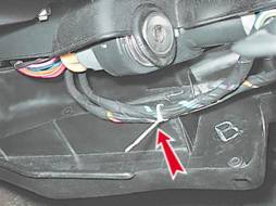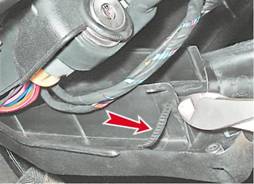 5. Снимаем с кронштейна верхний кожух рулевого вала. Установка 1. Ленточным хомутом закрепляем жгут проводов подрулевого переключателя к нижнему кожуху рулевого вала.