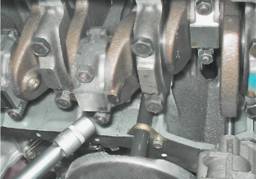 Вынимаем вкладыши из шатунов и их крышек. 9. Торцовым ключом на 17 мм ослабляем болты крепления крышек коренных подшипников коленчатого вала.
