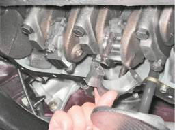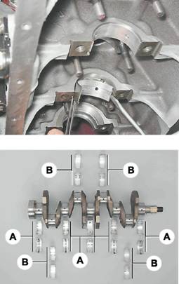 Коренные (А) и шатунные (В) Примечание При наличии любых трещин на шейках или щеках коленчатый вал подлежит замене. 13. Микрометром измеряем диаметры коренных и шатунных шеек и сравниваем с данными, приведенными в таблице 8.1.1. Если износ или овальность больше 0,03 мм, то шейки необходимо прошлифовать в специализированной мастерской, где имеется в наличии необходимое оборудование (там же необходимо проверить осевое биение основных поверхностей коленчатого вала). После шлифовки повторно измеряем диаметры шеек коленчатого вала для определения ремонтного размера вкладышей. Установка 1. Промываем коленчатый вал в керосине и продуваем сжатым воздухом его внутренние полости. Устанавливаем новые вкладыши коренных подшипников коленчатого вала номинального или ремонтного размера. На наружной цилиндрической поверхности вкладышей выбиты цифры, указывающие ремонтный размер: 025 - первый ремонтный, под шейку коленчатого вала, уменьшенную по диаметру на 0,25 мм. Соответственно при втором, третьем и четвертом ремонтных размерах будут значения: 050, 075, 100. Отличить шатунные вкладыши от коренных просто. На верхних коренных вкладышах (кроме среднего) выполнены кольцевые канавки. Кроме того, вкладыши средней опоры шире остальных. Шатунные вкладыши все одинаковые и взаимозаменяемые, их диаметр меньше диаметра коренных. Для увеличения площади контакта на шатунных вкладышах нет кольцевых канавок. 2. Устанавливаем в проточки постели пятого коренного подшипника упорные полукольца канавками к коленчатому валу. Полукольца изготавливаются нормальной толщины (2,310-2,360 мм) и увеличенной (2,437-2,487 мм). 3. Проверяем осевой зазор между упорными полукольцами и упорными поверхностями коленчатого вала, который должен быть в пределах 0,06-0,26 мм. Если зазор превышает максимально допустимый (0,35 мм), заменяем упорные полукольца новыми, увеличенными на 0,127 мм. 4. Смазываем шатунные и коренные шейки коленчатого вала моторным маслом и устанавливаем вал в блок. 5. В соответствии с метками устанавливаем крышки коренных подшипников и затягиваем болты их крепления моментом 68,4-84,3 Н.м. Проверяем свободное вращение вала. 6. Устанавливаем на коленчатый вал шатуны с вкладышами и крышками. Затягиваем гайки креплений моментом 43,4-53,5 Н.м. 7. Устанавливаем поддон картера двигателя (см. "Поддон картера двигателя - снятие и установка"). 8. Устанавливаем на блок цилиндров держатель с сальником (см. "Задний сальник коленчатого вала - замена"). 9. Установка остальных снятых деталей выполняется в обратной последовательности. 10. Регулируем натяжение цепи (см. "Цепь привода газораспределительного механизма - замена). 11. Регулируем натяжение ремня привода генератора (см. "Ремень привода генератора - регулировка натяжения и замена"). 12. На карбюраторном двигателе проверяем и при необходимости корректируем угол опережения зажигания (см. "Момент зажигания - проверка и регулировка"). |