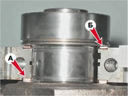 10. Отвернув два болта, снимаем крышку заднего коренного подшипника. В проточках задней опоры коленчатого вала установлены два упорных полукольца. Переднее кольцо А - сталеалюминиевое, а заднее Б - металлокерамическое. Кольца можно вынуть, нажав на их торцы тонкой отверткой.