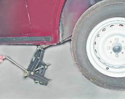 4. Устанавливаем подъемный рычаг домкрата в гнездо кронштейна, расположенного под днищем кузова, и вращаем рукоятку домкрата по часовой стрелке до тех пор, пока колесо не окажется приподнятым над поверхностью дороги.