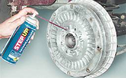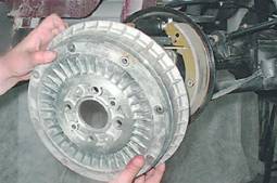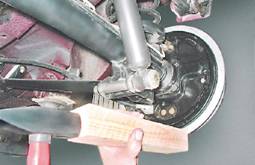 6. Равномерно поворачивая тормозной барабан и нанося удары молотком через деревянный брусок по фланцу с внутренней стороны, сбиваем барабан.