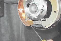 10. Снимаем две чашки с пружиной и стойкой. Аналогично снимаем детали опорной стойки с другой колодки. 11. Поддев отверткой, снимаем нижнюю стяжную пружину.