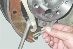 17. Снимаем с колодки шайбу, рычаг и ось. Установка 1. Раздвижными пассатижами сдвигаем внутрь поршни рабочего цилиндра. 2. Устанавливаем снятые детали привода стояночного тормоза на новую тормозную колодку в обратной последовательности. 3. Ориентируем распорную планку двойной прорезью к задней колодке. 4. После установки тормозного барабана несколько раз резко нажимаем педаль тормоза для того, чтобы упорные кольца в колесном цилиндре заняли свое рабочее положение. 5. Аналогично заменяем колодки с противоположной стороны автомобиля. 6. Регулируем стояночный тормоз (см. "Стояночный тормоз - регулировка"). |
