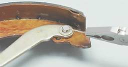15. Отсоединяем от колодок распорную планку и стяжную пружину. 16. Пассатижами извлекаем шплинт из оси распорного рычага.
