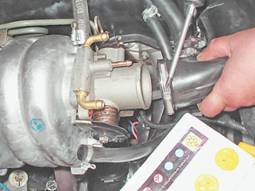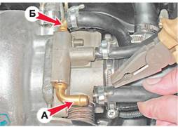 Корпус дроссельной заслонки - снятие и установкаКорпус дроссельной заслонки снимаем для замены регулятора холостого хода, уплотнительной прокладки или самого корпуса. Внимание! Во избежание ожогов приступать к выполнению работы следует только после остывания двигателя. Снятие 1. Подготавливаем автомобиль к выполнению операций ("Подготовка автомобиля к ТО и ремонту"). 2. Отсоединяем провод от отрицательного вывода аккумуляторной батареи (см. "Аккумуляторная батарея - снятие и установка"). Внимание! При замене только уплотнительной прокладки корпуса дроссельной заслонки нет необходимости отсоединять от него шланги, колодки и воздуховод достаточно выполнить - п.п. 10 и 11 (см. ниже). В других случаях выполняем все нижеприведенные операции. 3. Отсоединяем от сектора трос привода дроссельной заслонки (см. "Трос привода дроссельной заслонки - замена"). 4. Отсоединяем колодку проводов от датчика положения дроссельной заслонки (см. "Датчик положения дроссельной заслонки - проверка и замена"). 5. Отжав фиксатор, отсоединяем колодку проводов от регулятора холостого хода (см. "Регулятор холостого хода - проверка, снятие и установка"). Внимание! При выполнении следующей операции из штуцеров и шлангов вытечет небольшое количество охлаждающей жидкости. 6. Ослабив хомут, снимаем со штуцера А корпуса дроссельной заслонки шланг отвода охлаждающей жидкости. Аналогично отсоединяем от штуцера Б шланг подвода жидкости.
