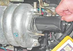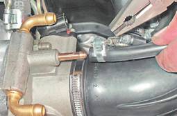 9. Тем же инструментом ослабляем червячный хомут шланга подвода паров топлива к штуцеру корпуса дроссельной заслонки и снимаем шланг.
