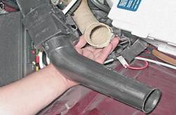 6. Ослабив хомут крепления шланга воздухозаборника теплого воздуха, снимаем шланг с патрубка терморегулятора.