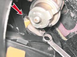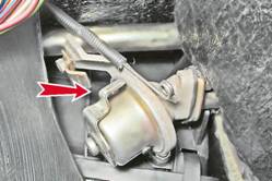 6. Отсоединяем правый воздуховод от кожуха радиатора (см. "Электродвигатель вентилятора отопителя - замена"). 7. Торцовым ключом на 7 мм ослабляем болт крепления тяги привода крана отопителя.
