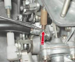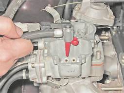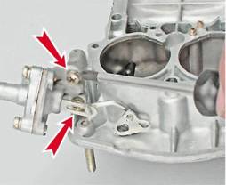 Крышка карбюратора - снятие и разборкаНеобходимость в снятии крышки карбюратора возникает при регулировке уровня топлива в поплавковой камере, проверке и замене игольчатого клапана, продувке и очистке каналов жиклеров и топливных каналов корпуса карбюратора. Для выполнения работы потребуется очиститель карбюратора в аэрозольной упаковке. Порядок выполнения 1. Подготавливаем автомобиль к выполнению операций (см. "Подготовка автомобиля к ТО и ремонту"). 2. Снимаем корпус воздушного фильтра (см. "Корпус воздушного фильтра - снятие и установка"). 3. Ветошью и кисточкой очищаем от грязи и промываем уайт-спиритом или очистителем двигателя наружную поверхность карбюратора. 4. Отсоединяем от крышки карбюратора трос привода воздушной заслонки и снимаем топливный шланг со штуцера (см. "Карбюратор - снятие и установка"). 5. Поддев отверткой, отсоединяем телескопическую тягу от трехплечего рычага.