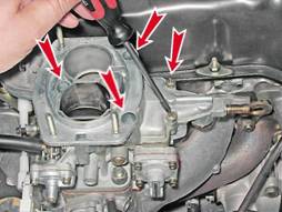 6. Крестовой отверткой отворачиваем пять винтов крепления крышки к корпусу карбюратора.