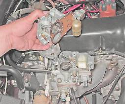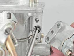 Между корпусом и крышкой карбюратора установлена уплотнительная прокладка. При наличии изломов и разрывов заменяем прокладку. 8. Для замены прокладки необходимо снять игольчатый клапан (см. выше, "Игольчатый клапан и поплавок - замена").