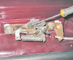 8. Наносим небольшое количество смазки на трос привода и трущиеся детали замка капота.