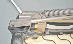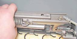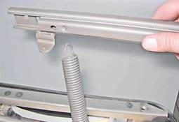 9. Снимаем наружные салазки вместе с направляющей, выводя крючок пружины из отверстия в салазках.