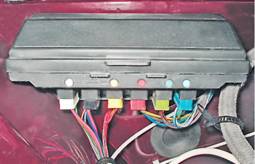 Через монтажный блок осуществляется соединение жгутов проводов моторного отсека со жгутом проводов панели приборов и жгутом, идущим к задней части автомобиля. Колодки жгутов окрашены в разные цвета, а на стенках блока нанесены цветные метки соответствующего разъема. Номера предохранителей и пиктограммы обозначения реле нанесены на внутренней поверхности крышки блока. На автомобиле применены предохранители флажкового типа, которые в зависимости от силы максимального тока имеют различную окраску: