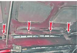 4. Для снятия верхней части облицовки торцовым ключом на 8 мм отворачиваем четыре гайки ее крепления к капоту.