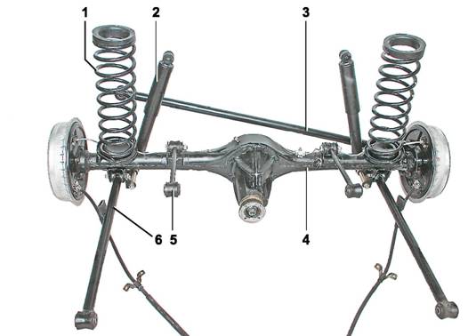 Детали задней подвески: 1 - пружина (2101-2912712); 2 - амортизатор (21012915402-04); 3 - поперечная штанга (2101-2919110-01); 4 - балка заднего моста (2101-2401010-01); 5 - верхняя продольная штанга (2101-2919013-01); 6 - нижняя продольная штанга (2101-2919012-01 (10-01))Задняя подвеска - зависимая. Жесткая балка заднего моста подвешена к кузову на пяти штангах, четырех продольных и одной поперечной. Нижние продольные штанги более длинные, верхние - короткие. Благодаря своему креплению к заднему мосту со смещением относительно оси колес каждая пара штанг воспринимает реактивные моменты при ускорении и торможении автомобиля, поэтому штанги называются реактивными. Кроме того, они передают толкающие и тянущие усилия от заднего моста на кузов. Поперечная штанга расположена позади балки заднего моста, она удерживает задний мост от бокового смещения. Все штанги соединены с кузовом и задним мостом резинометаллическими шарнирами (сайлент-блоками). Упругие элементы подвески состоят из двух цилиндрических пружин, двух основных и одного дополнительного буферов хода сжатия. Нижние торцы пружин опираются через пластмассовые прокладки на чашки, приваренные к балке заднего моста. Верхние торцы пружин установлены в опорных чашках кузова через резиновые изолирующие прокладки. Основные резиновые буферы хода сжатия размещены внутри пружин и крепятся к кузову. Дополнительный буфер закреплен на днище кузова над картером заднего моста. Буфер воспринимает нагрузку только при движении автомобиля по неровной дороге с большой скоростью, перегрузке или при разрушении основных буферов. Колебания заднего моста гасятся двумя двухтрубными телескопическими масляными амортизаторами. В них энергия колебаний переводится в тепло, путем прокачки жидкости через калиброванные отверстия. Нижние и верхние концы амортизаторов соединены соответственно с балкой заднего моста и кузовом болтами также через резинометаллические шарниры. |