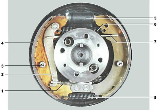 Тормозной механизм заднего колеса: 1 - задний трос привода стояночного тормоза (2101-3508180); 2 - распорный рычаг стояночного тормоза (21013507034/35); 3 - чашка наружная опорной стойки (2101-3502104); 4 - тормозная колодка (2101-3502090-01); 5 - рабочий цилиндр (2105-3502040); 6 - верхняя стяжная пружина (2101-3502035); 7 - распорная планка (2101-3507036); 8 - нижняя стяжная пружина (2101-3502038)На автомобиле установлены две тормозные системы - рабочая и стояночная. Гидравлический привод рабочей системы состоит из двух независимых контуров, приводящих в действие тормозные механизмы передних и задних колес. При нарушении в работе одного контура автомобиль затормаживается вторым контуром, хотя и с увеличением хода педали тормоза и тормозного пути. Рабочая система состоит из педального узла, вакуумного усилителя, главного тормозного цилиндра, бачка с датчиком уровня тормозной жидкости, трубопроводов, тормозных механизмов передних и задних колес с рабочими цилиндрами и регулятора давления задних тормозов. Педаль тормоза закреплена на одной оси с педалью сцепления и снабжена возвратной пружиной. Над педалью расположен выключатель сигналов торможения, буфер которого при правильной регулировке должен касаться упора педали. При нажатии педали тормоза контакты выключателя замыкаются и загораются лампы сигналов торможения в задних фонарях. Вакуумный усилитель, установленный на перегородке моторного отсека, служит для снижения усилия на педали тормоза за счет разрежения во впускном трубопроводе при работающем двигателе. Главный тормозной цилиндр установлен на двух шпильках, ввернутых в корпус вакуумного усилителя, и крепится к нему гайками. В цилиндр ввернуты штуцеры тормозных трубок переднего и заднего контуров рабочей тормозной системы. На перегородке моторного отсека хомутом закреплен бачок, из которого тормозная жидкость по шлангам подводится к главному тормозному цилиндру. На бачке выполнены метки максимального и минимального уровней жидкости. В крышке бачка установлен датчик уровня жидкости с поплавком. При падении уровня жидкости в бачке ниже допустимого в комбинации приборов красным светом загорается сигнальная лампа. Тормозной механизм переднего колеса - дисковый и состоит из чугунного, невентилируемого тормозного диска, суппорта с двумя рабочими цилиндрами и двух тормозных колодок. Тормозной диск заменяют при износе его рабочей поверхности до толщины менее 9,5 мм. Рабочие цилиндры правого и левого тормозных механизмов - невзаимозаменяемые. Минимально допустимая толщина накладки колодки тормозного механизма переднего колеса 1,5 мм. Тормозной механизм заднего колеса - барабанный и состоит из тормозного барабана, рабочего цилиндра, двух тормозных колодок со стяжными пружинами и распорного рычага привода стояночного тормоза. Тормозной барабан - алюминиевый с чугунной вставкой. Наибольший допустимый внутренний диаметр барабана при износе или после расточки - 251 мм. Рабочий цилиндр - двухпоршневой, с механизмом автоматической регулировки зазора между барабаном и колодками. Основным элементом механизма автоматической регулировки зазора являются два упругих стальных разрезных кольца, установленных на поршнях в рабочем цилиндре с осевым зазором 1,25-1,65 мм. Упорные кольца установлены в цилиндре с натягом, обеспечивающим усилие сдвига по зеркалу цилиндра не менее 35 
