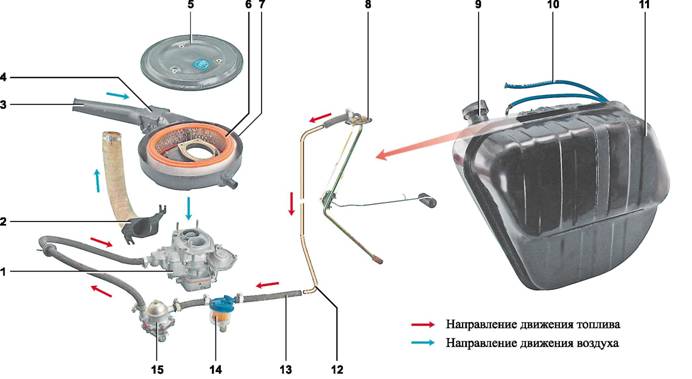 Детали системы питания карбюраторного двигателя: 1 - карбюратор; 2 - воздухозаборник теплого воздуха; 3 - воздухозаборник холодного воздуха; 4 - терморегулятор; 5 - крышка корпуса воздушного фильтра; 6 - фильтрующий элемент; 7 - корпус воздушного фильтра; 8 - датчик указателя уровня и резерва топлива; 9 - заливная горловина; 10 - вентиляционный шланг; 11 - топливный бак; 12 - топливопровод; 13 - топливный шланг; 14 - топливный фильтр; 15 - топливный насосТопливный бак сварен из двух половин, отштампованных из листовой освинцованной стали. Снаружи бак окрашен черной эмалью. На автомобиле установлен топливный бак объемом 39 л. Бак расположен в багажнике с правой стороны по ходу движения автомобиля и прикреплен к кузову хомутом, стянутым болтом. Заливная горловина выведена в нишу на правом заднем крыле и закрыта резьбовой пробкой. Для вентиляции топливный бак имеет шланг, выведенный в нишу заливной горловины. Сверху на баке через уплотнительную прокладку установлен датчик указателя уровня и резерва топлива. От датчика на щиток приборов выводятся данные об остатке топлива в баке. Когда топлива остается 4,0-6,5 л, на щитке приборов загорается контрольная лампа. Топливопроводы изготовлены из стальных оцинкованных трубок и закреплены снизу на днище кузова держателями. Детали топливной системы соединены между собой резиновыми шлангами, закрепленными стяжными хомутами. Топливный насос - диафрагменного типа, с механическим приводом и рычагом ручной подкачки. Насос расположен на левой стороне блока цилиндров и закреплен через теплоизоляционную проставку и прокладки на двух шпильках гайками. Привод насоса осуществляется через толкатель от эксцентрика на валу привода вспомогательных агрегатов или от рычага ручной подкачки. Производительность насоса не менее 60 л/ч при частоте качаний 2000 циклов в минуту. Давление, создаваемое насосом, находится в пределах 0,20- 0,30 кгс/см². Насос состоит из нижнего корпуса с рычагами привода, верхнего корпуса с впускным и нагнетательным клапанами, диафрагменного узла и крышки. Диафрагменный узел имеет две верхних рабочих и одну нижнюю (предохранительную) диафрагмы, установленные на штоке. Между рабочими и предохранительной прокладкой установлены внутренняя и наружная дистанционные прокладки. С целью предотвращения попадания топлива в картер двигателя в случае повреждения рабочих диафрагм бензонасоса, в наружной прокладке выполнено отверстие для слива топлива.