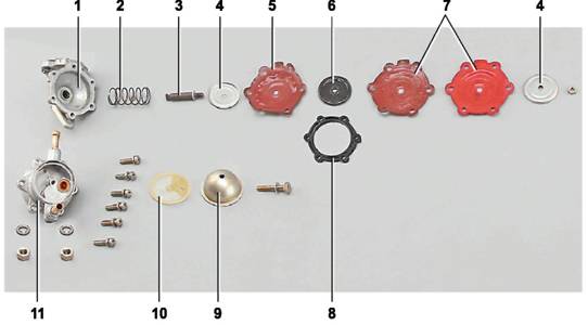 Детали топливного насоса: 1 - нижний корпус; 2 - возвратная пружина; 3 - шток; 4 - тарелка диафрагменного узла; 5 - предохранительная диафрагма; 6 - внутренняя дистанционная прокладка; 7 - рабочие диафрагмы; 8 - наружная дистанционная прокладка; 9 - крышка насоса; 10 - сетчатый фильтр; 11 - верхний корпусВоздушный фильтр - сухой, со сменным фильтрующим элементом, обеспечивающим очистку поступающего в карбюратор воздуха. Корпус фильтра установлен на крышке карбюратора через резиновую прокладку с дистанционными втулками на четырех шпильках и крепится самоконтрящимися гайками. Сверху корпус фильтра закрыт крышкой с резиновой уплотнительной прокладкой. В воздуховоде перед корпусом воздушного фильтра установлен терморегулятор, позволяющий изменять температуру поступающего воздуха. В зависимости от одного из трех положений заслонки терморегулятора воздух забирается через воздухозаборник теплого или холодного воздуха либо от обоих одновременно. Положение заслонки устанавливается вручную в соответствии с температурой окружающего воздуха. Корпус воздушного фильтра соединен шлангом подвода картерных газов с крышкой маслоотделителя вытяжной системы вентиляции картера. В шланге подвода картерных газов установлен пламегаситель. На автомобиле установлен карбюратор модели 2107-1107010. Карбюратор эмульсионного типа, двухкамерный, с падающим потоком. Горючая смесь образуется из поступающего через воздушный фильтр воздуха и топлива, подаваемого насосом. При этом обеспечивается бесперебойная подача горючей смеси оптимального состава на всех режимах работы двигателя. Приготовленная смесь всасывается через впускной трубопровод в цилиндры двигателя. Карбюратор состоит из трех корпусных деталей: крышки, корпуса карбюратора и корпуса дроссельных заслонок.