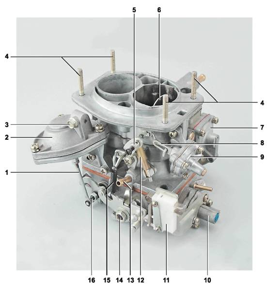 Карбюратор 2107-1107010: 1 - тяга пневмопривода дроссельной заслонки вторичной камеры; 2 - пневмопривод дроссельной заслонки вторичной камеры; 3 - болт крепления оболочки тяги привода воздушной заслонки; 4 - шпилька крепления корпуса воздушного фильтра; 5 - муфта с винтом крепления тяги привода воздушной заслонки; 6 - воздушная заслонка; 7 - крышка ускорительного насоса; 8 - шток диафрагмы пускового устройства; 9 - пусковое устройство; 10 - экономайзер принудительного холостого хода; 11 - микропереключатель; 12 - телескопическая тяга; 13 - патрубок отвода картерных газов; 14 - ось дроссельной заслонки первичной камеры; 15 - возвратная пружина блокировки открытия заслонки вторичной камеры; 16 - ось дроссельной заслонки вторичной камерыКарбюратор установлен на четырех шпильках впускного трубопровода. В крышке карбюратора выполнены входные горловины первичной и вторичной смесительных камер, штуцер подвода топлива от топливного насоса, топливные и воздушные каналы. На крышке также закреплены игольчатый клапан подачи топлива и поплавок, обеспечивающие необходимый уровень топлива в поплавковой камере. В корпусе карбюратора выполнены большие диффузоры и поплавковая камера. Внутри больших диффузоров установлены съемные малые диффузоры, отлитые заодно с распылителями эконостата и главных дозирующих систем. В корпусе карбюратора выполнены воздушные и топливные каналы, установлены воздушные и топливные жиклеры и распылитель ускорительного насоса. Ускорительный насос обеспечивает подачу дополнительной порции топлива в первичную смесительную камеру при резком нажатии на педаль "газа". Насос диафрагменного типа выполнен в приливе корпуса и закрыт крышкой, закрепленной четырьмя винтами. Диафрагма насоса перемещается рычагом. Для обеспечения плавности хода и соответственно плавного и продолжительного впрыска, в телескопическом стакане диафрагмы установлена демпфирующая пружина. Рычаг ускорительного насоса приводится от кулачка, закрепленного на оси дроссельной заслонки первичной камеры.
