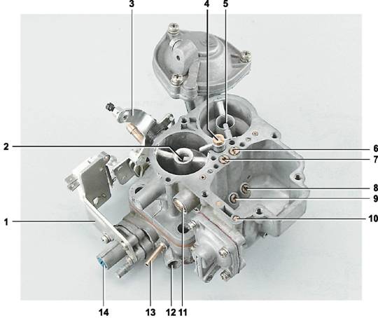 Корпус карбюратора: 1 - кронштейн микропереключателя; 2 - малый диффузор первичной камеры; 3 - трехплечий рычаг; 4 - распылитель ускорительного насоса; 5 - малый диффузор вторичной камеры; 6 - главный воздушный жиклер вторичной камеры; 7 - главный воздушный жиклер первичной камеры; 8 - главный топливный жиклер вторичной камеры; 9 - главный топливный жиклер первичной камеры; 10 - регулировочный винт подачи топлива ускорительным насосом; 11 - корпус топливного жиклера системы холостого хода; 12 - регулировочный винт состава (качества) смеси на холостом ходу; 13 - штуцер подвода разряжения к вакуумному регулятору распределителя зажигания; 14 - регулировочный винт количества смеси на холостом ходу с ограничительной втулкойДля запуска и работы двигателя при прогреве в карбюраторе имеются пусковое устройство и воздушная заслонка. Воздушная заслонка установлена на оси во входной горловине первичной камеры крышки карбюратора. Привод заслонки осуществляется с места водителя тросом от рукоятки управления. Корпус пускового устройства крепится двумя винтами к крышке карбюратора. Шток диафрагмы привода пускового устройства соединен тягой с рычагом воздушной заслонки. Полость пускового устройства соединена воздушным каналом с первичной смесительной камерой. При запуске двигателя в полости создается разрежение. Шток диафрагмы отжимает возвратную пружину, воздействует на тягу и приоткрывает воздушную заслонку. Регулировка холостого хода осуществляется винтами состава (качества) и количества смеси. Винт регулировки состава установлен в отверстии прилива корпуса дроссельных заслонок и закрыт заглушкой. Винт регулировки количества смеси установлен в крышке экономайзера. |