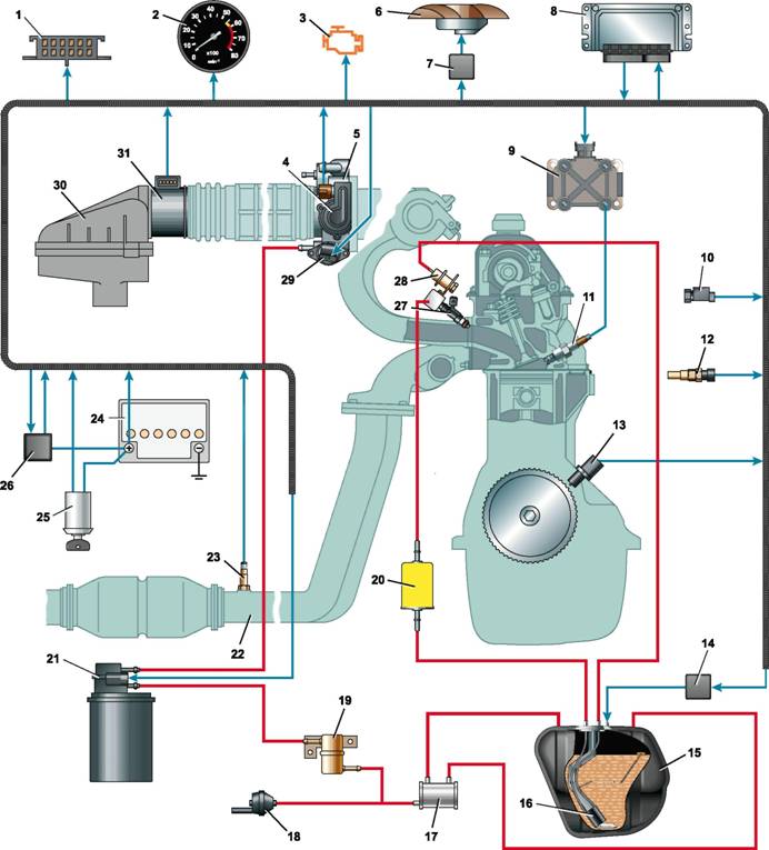 Элементы системы управления двигателем: 1 - диагностический разъем; 2 - тахометр; 3 - контрольная лампа неисправности системы управления двигателем; 4 - датчик положения дроссельной заслонки; 5 - корпус дроссельной заслонки; 6 - электровентилятор радиатора; 7 - реле электровентилятора; 8 - электронный блок управления; 9 - катушка (модуль) зажигания; 10 - датчик скорости автомобиля; 11 - свеча зажигания; 12 - датчик температуры охлаждающей жидкости; 13 - датчик положения коленчатого вала; 14 - реле электробензонасоса; 15 - топливный бак; 16 - электробензонасос; 17 - перепускной клапан; 18 - предохранительный клапан; 19 - гравитационный клапан; 20 - топливный фильтр; 21 - клапан продувки адсорбера; 22 - приемная труба; 23 - датчик концентрации кислорода; 24 - аккумуляторная батарея; 25 - выключатель (замок) зажигания; 26 - главное реле; 27 - форсунка; 28 - регулятор давления топлива; 29 - регулятор холостого хода; 30 - корпус воздушного фильтра; 31 - датчик массового расхода воздухаСистема управления двигателем с распределенным впрыском топлива - электронная. Она контролирует количество воздуха и топлива, поступающего в цилиндры двигателя, включает и выключает топливный насос, управляет искрообразованием на свечах зажигания и корректирует угол опережения зажигания, регулирует частоту вращения коленчатого вала на холостом ходу, управляет электровентилятором системы охлаждения двигателя.