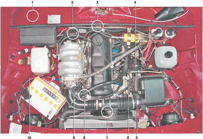 Расположение элементов системы управления двигателем: 1 - электронный блок управления, реле и предохранители (расположены под вещевым ящиком в салоне); 2 - датчик концентрации кислорода (расположен на приемной трубе); 3 - датчик скорости автомобиля (расположен на коробке передач); 4 - клапан продувки адсорбера; 5 - датчик массового расхода воздуха; 6 -катушка зажигания; 7 - датчик положения коленчатого вала (расположен на крышке привода распределительного вала); 8 - датчик температуры охлаждающей жидкости (расположен в патрубке системы охлаждения); 9 - датчик положения дроссельной заслонки; 10 - жгут проводов системы управленияСистема состоит из следующих элементов: • электронного блока управления (ЭБУ); • датчиков: • исполнительных устройств: - главного реле; • соединительных проводов; • колодки диагностического разъема. Контрольная лампа неисправности системы управления двигателем расположена на щитке приборов в блоке сигнализаторов (см. "Органы управления и контрольные приборы"). При включении зажигания происходит тестирование исправности системы, при этом лампа загорается и гаснет после запуска двигателя. Включение лампы при работающем двигателе сигнализирует о необходимости проверки системы управления двигателем. На некоторых модификациях автомобилей контрольная лампа может быть расположена на верхнем вкладыше панели радиоприемника. Главный управляющий элемент системы - электронный блок управления (ЭБУ, или как часто его называют - контроллер), с встроенным микропроцессором.