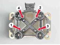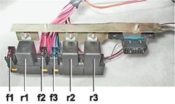 Предохранители и реле системы управления двигателем : f1 - предохранитель цепи главного реле (7,5 A); f2 - предохранитель ЭБУ (7,5 A); f3 - предохранитель цепи электробензонасоса (15 A); r1 - главное реле; r2 - реле топливного насоса; r3 - реле электровентилятора.Примечание На автомобилях с ЭБУ M1.5.4N и Январь-5.1.3 установлены предохранители f1 и f2 номиналом 15А. Катушка зажигания установлена с левой стороны блока цилиндров на кронштейне. Катушка представляет собой объединенные в один неразборный блок два высоковольтных трансформатора. Выводы вторичной обмотки одной катушки соединены высоковольтными проводами со свечами 1-го и 4-го цилиндров, другой - со свечами 2-го и 3-го цилиндров. Номера цилиндров, со свечами которых соединяются выводы катушки, нанесены рядом с выводами.