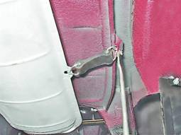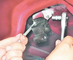 5. Снимаем основной глушитель. 6. Для замены подушки очищаем соединение и обрабатываем проникающей смазкой. 7. Ключом на 7 мм отворачиваем гайку крепления подушки к кронштейну кузова, удерживая болт от проворачивания ключом того же размера.