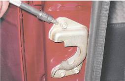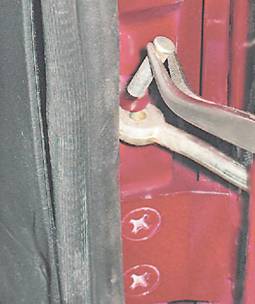 2. Выколоткой выбиваем вверх из петель кузова палец ограничителя открывания двери и плоскогубцами извлекаем палец.