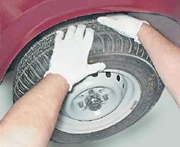 7. Проверяем наличие осевого люфта в подшипниках ступицы переднего колеса. Вывесив колесо и взявшись за него в вертикальной плоскости, поочередно резкими движениями верхней части колеса на себя, а нижней - от себя определяем наличие люфта.