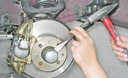 Подшипники ступицы переднего колеса - регулировкаУвеличенные зазоры в подшипниках ступицы переднего колеса приводят к снижению их срока службы, вибрациям при движении и ускоренному износу шин. Чрезмерно затянутые подшипники сильно нагреваются и теряют работоспособность. Последовательность выполнения 1. Подготавливаем автомобиль к выполнению операций (см. "Подготовка автомобиля к ТО и ремонту"). 2. Снимаем колесо (см. "Колесо - замена"). 3. С помощью зубила снимаем защитный колпак ступицы.