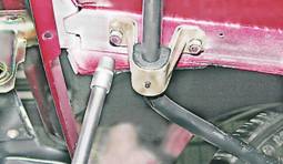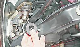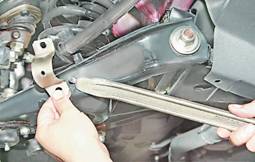 6. Торцовым ключом на 13 мм с удлинителем отворачиваем две гайки крепления кронштейна стабилизатора к лонжерону кузова. 7. Аналогично отворачиваем гайки крепления второго кронштейна и снимаем стабилизатор. Очищаем штангу стабилизатора от грязи. 8. Для замены подушки кронштейна стабилизатора зажимаем кронштейн в тисках. Если штанга стабилизатора не требует замены, то помечаем положение подушек кронштейна относительно штанги стабилизатора для облегчения последующей сборки. Смазываем мыльным раствором штангу стабилизатора для облегчения снятия кронштейна с подушкой. 9. Поворачивая штангу стабилизатора в разные стороны, вытягиваем ее из подушки кронштейна.